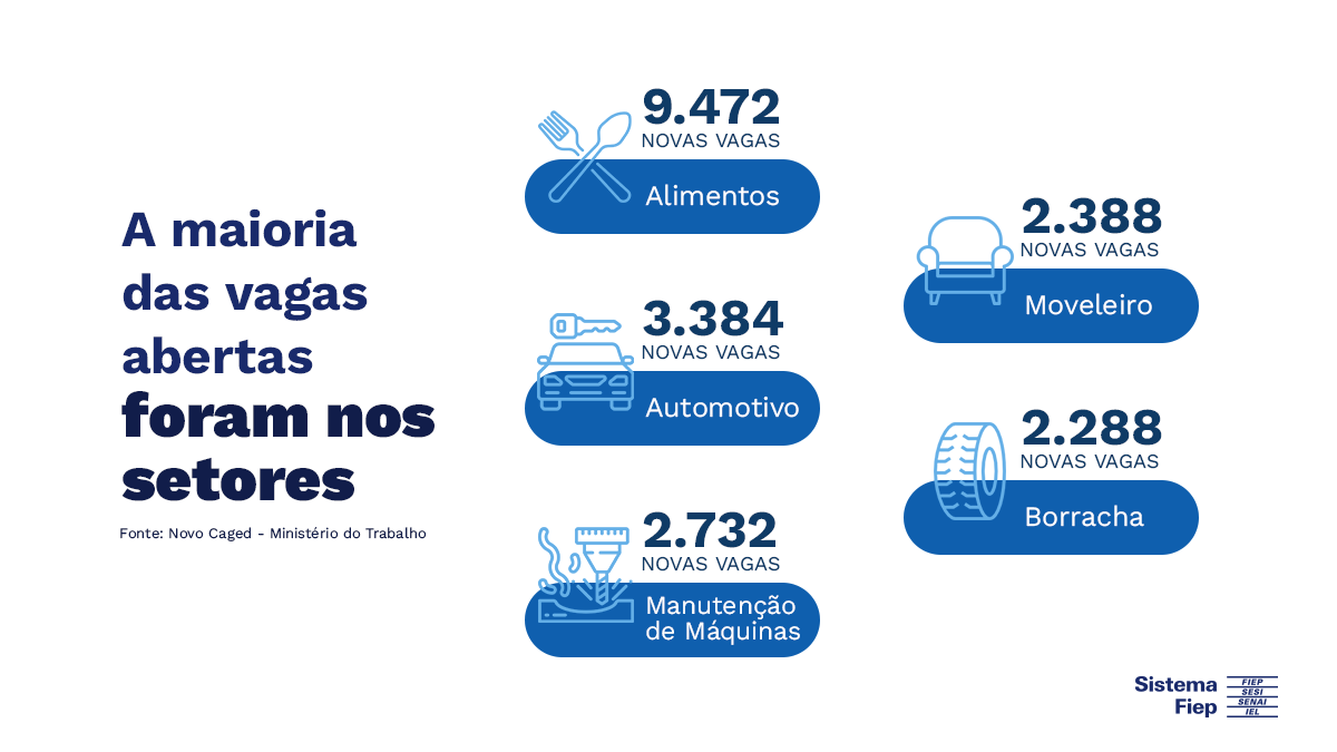 Entre as atividades que impulsionaram a geração de empregos, no ano, o setor de produtos alimentícios liderou com 9.472 novas vagas, seguido pelo automotivo (3.384), manutenção e reparação de máquinas e equipamentos (2.732), móveis (2.388) e borracha e material plástico (2.288). Dos 24 segmentos avaliados pelo Novo Caged, apenas dois registraram fechamento de postos de trabalho: confecção e artigos do vestuário (-1.163) e fumo (-13).