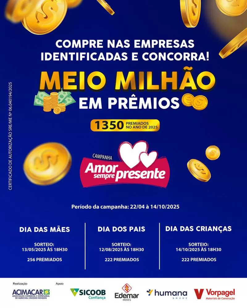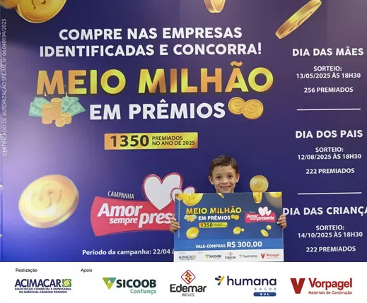 A campanha “Amor Sempre Presente” é realizada pela Acimacar em parceria com as empresas do comércio de Marechal Cândido Rondon. Ela é legalizada pela Secretaria de Acompanhamento Fiscal, Energia e Loterias (Sefel) do Ministério da Fazenda e conta com o patrocínio de Edemar Imóveis, Sicoob Confiança, Humana Saúde e Vorpagel Materiais de Construção.