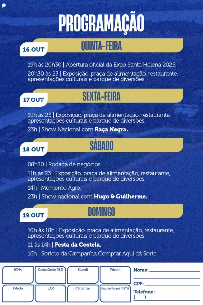 A maior feira multissetorial do município, a Expo Santa Helena 2025, será realizada entre os dias 16 e 19 de outubro, no Balneário Terra das Águas. O evento reunirá expositores do comércio, indústria e setor de serviços, além de programação cultural e de entretenimento.