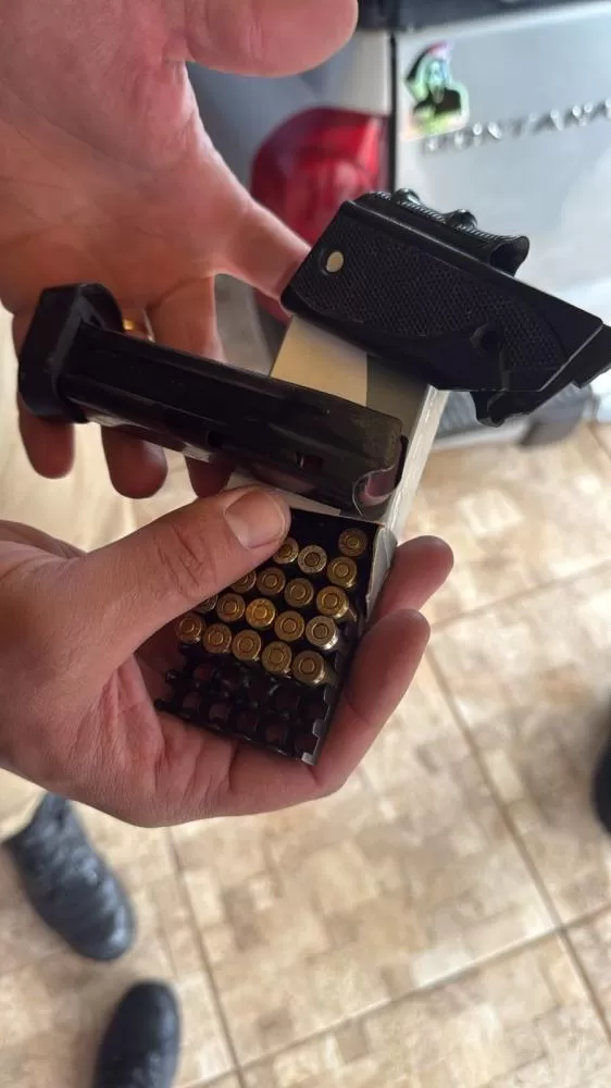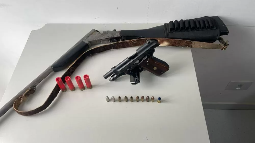 Na residência de um dos autores das ameaças, no Bairro Tranqueira, foi localizado um carregador de pistola calibre .380 e uma caixa de munições, sendo indicado então o paradeiro da arma correspondente, que foi encontrada de posse de um outro homem, juntamente com uma espingarda calibre 12, que eram mantidas de forma irregular, sem documento de porte, nem o devido registro.