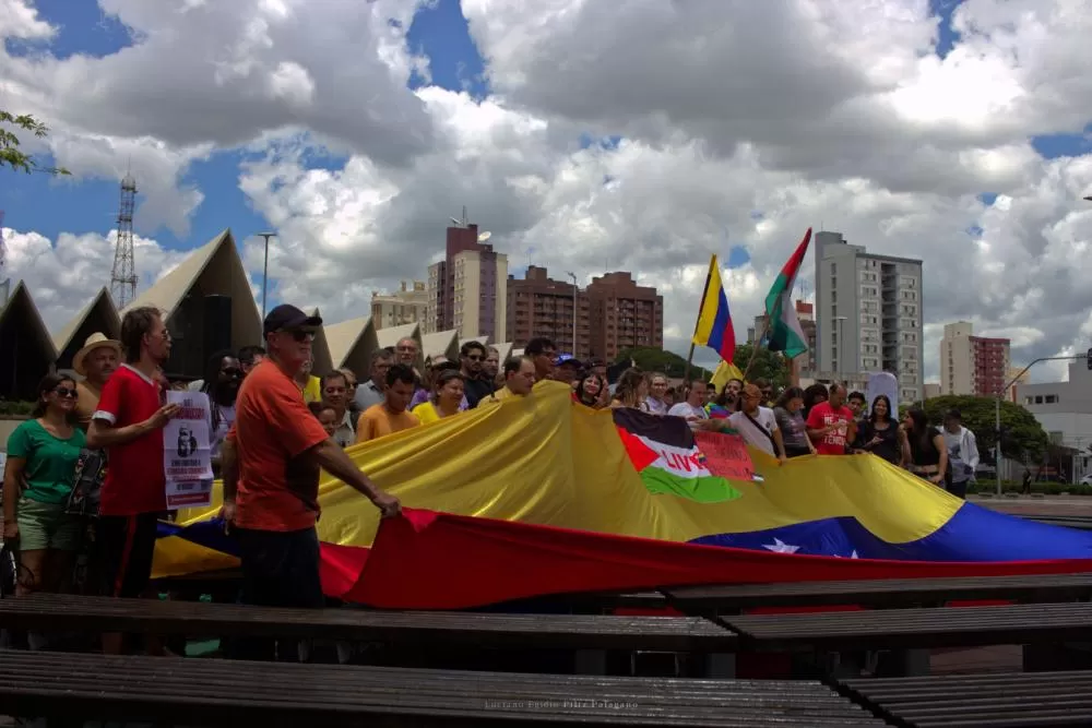 CASCAVEL (PR) — O Calçadão em frente à Catedral de Cascavel tornou-se, na manhã deste sábado (24), palco de um intenso debate sobre a conjuntura internacional e seus reflexos no Cone Sul. Cerca de 150 pessoas de diversos municípios da região participaram do ato convocado pelo Comitê em Defesa da Palestina e da América Latina, unificando vozes em apoio à autodeterminação dos povos e contra o intervencionismo estrangeiro.