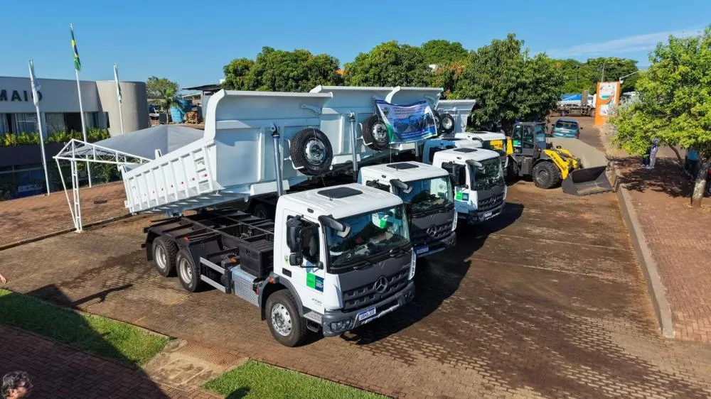 Foram entregues cinco caminhões caçamba, além de uma pá carregadeira. Os equipamentos passam a integrar a frota do município e serão utilizados em obras, manutenção de estradas, serviços urbanos e apoio às comunidades do interior.