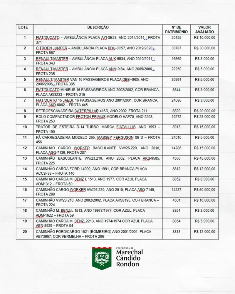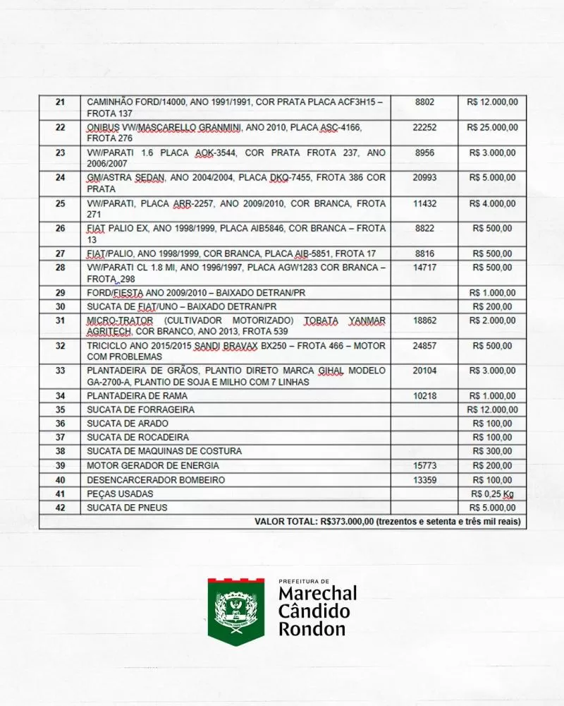 A prefeitura de Marechal Cândido Rondon promoverá leilão público para a alienação de bens