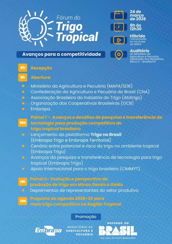O lançamento será no Ministério da Agricultura e Pecuária, durante o Fórum do Trigo Tropical. O evento acontece no turno da manhã, com início da programação às 9h. A apresentação da plataforma Trigo no Brasil está prevista para 10h.
