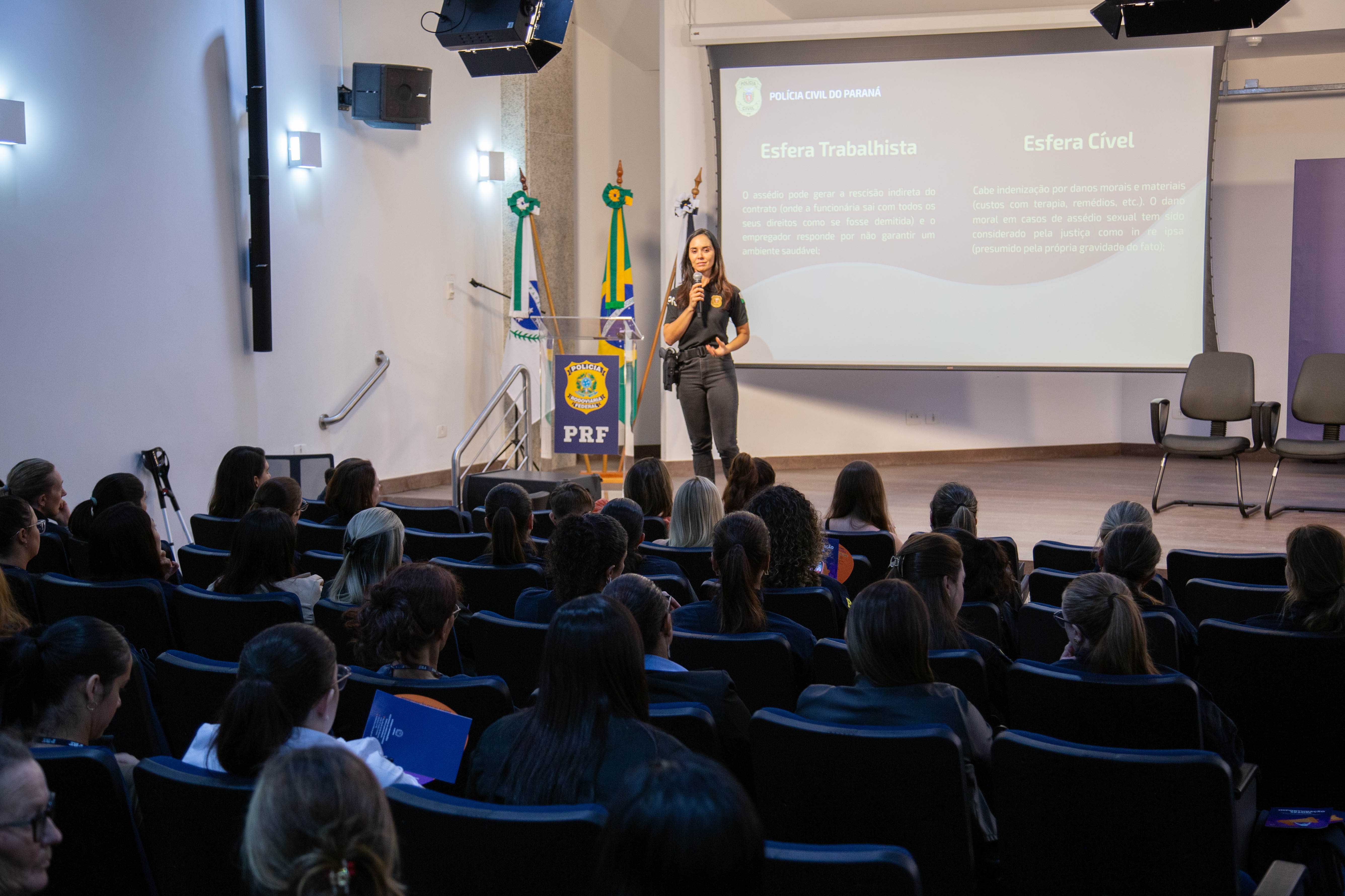 As policiais também participaram de palestra de enfrentamento ao assédio e à importunação sexual, conduzida pela Delegada da Polícia Civil no Paraná, Sâmia Coser.