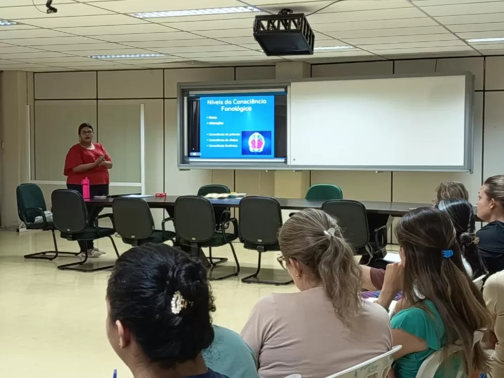 Durante a capacitação, os professores aprofundaram conhecimentos sobre a relação entre os sons da fala e a construção das palavras, além de discutirem formas de identificar, ainda nos estágios iniciais, possíveis dificuldades no processo de alfabetização.