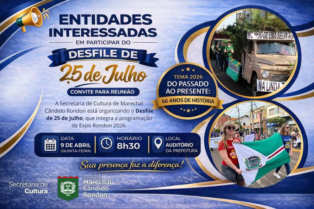 A Secretaria de Cultura de Marechal Cândido Rondon está organizando mais um Desfile de 25 de Julho, que integra a programação da Expo Rondon 2026. Neste ano, o evento terá como tema “Do Passado ao Presente: 66 Anos de História”, valorizando a trajetória e o desenvolvimento do município.