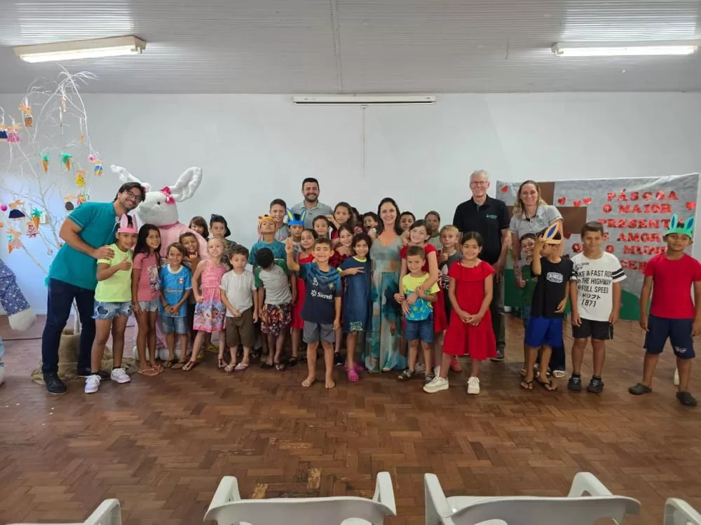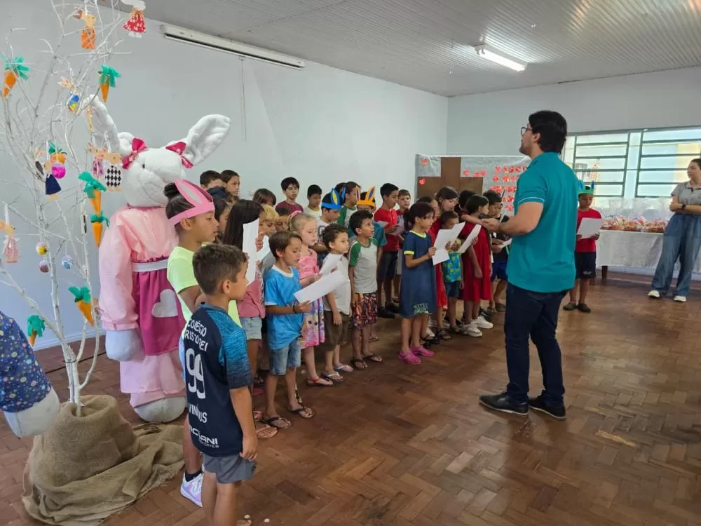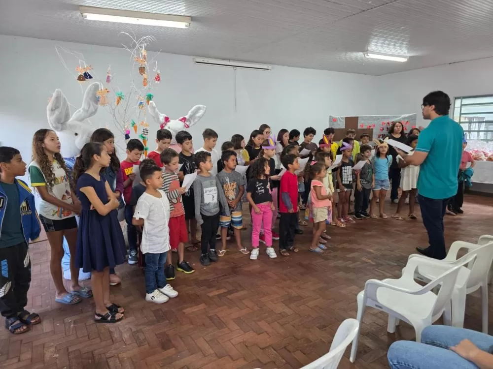 As crianças e adolescentes dos períodos matutino e vespertino atendidos pelo CAF, integrantes do coral da Associação Projeto Vida e Esperança (Aprove), realizaram uma apresentação especial em alusão ao período de Páscoa, sob a regência do professor Júlio Cesar.