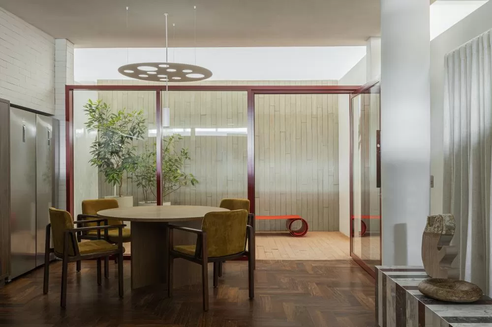 Inspirado em um verso de Paulo Leminski, o ambiente aposta na combinação de memória e contemporaneidade, com materiais que valorizam o tempo, do concreto pigmentado à madeira e ao inox, além do reuso de mármores do estado. O toque final fica por conta das referências artísticas, que evocam nomes como Poty Lazzarotto e Jaime Lerner, em uma composição que une arquitetura, design e identidade em alto estilo.