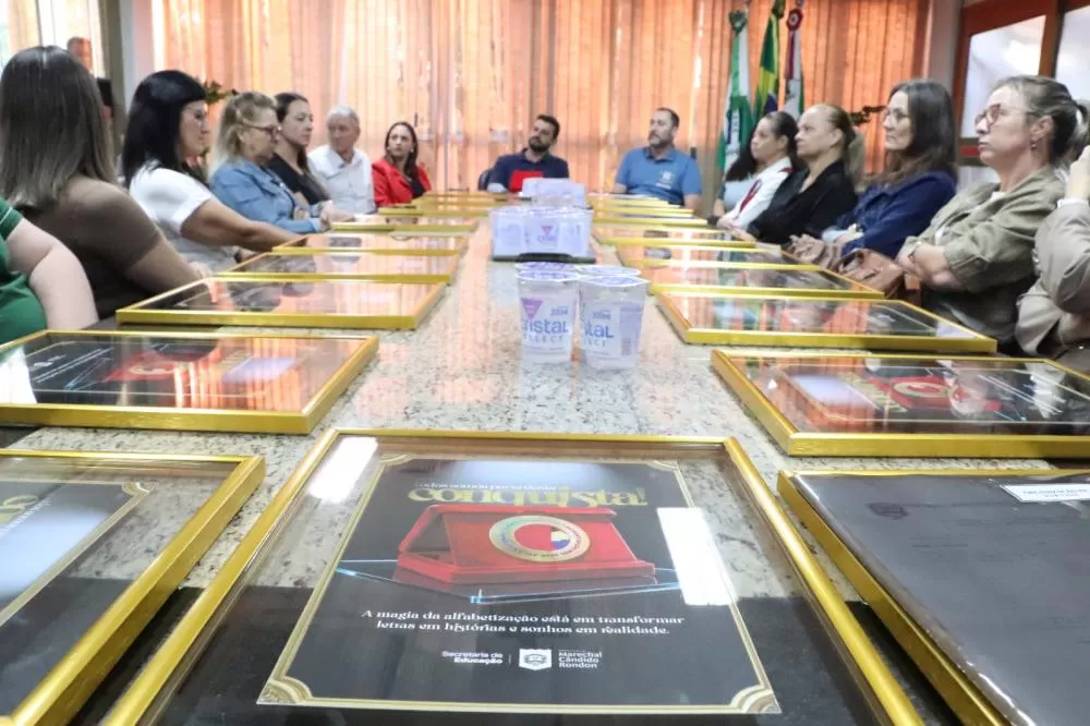 Um encontro marcado por emoção e sentimento de gratidão reuniu autoridades, educadores e equipes escolares na manhã desta quinta-feira, dia 16, na sala de reuniões do gabinete da prefeitura de Marechal Cândido Rondon. Na ocasião, a Secretaria de Educação prestou uma homenagem especial às 18 escolas municipais, com a entrega de um quadro alusivo à conquista do Selo Ouro na Educação, bem como a assessora pedagógica Sandra Pedron Wissmann, da secretaria de Educação, responsável pela coordenação das atividades para o envio das ações para que a certificação fosse possível.