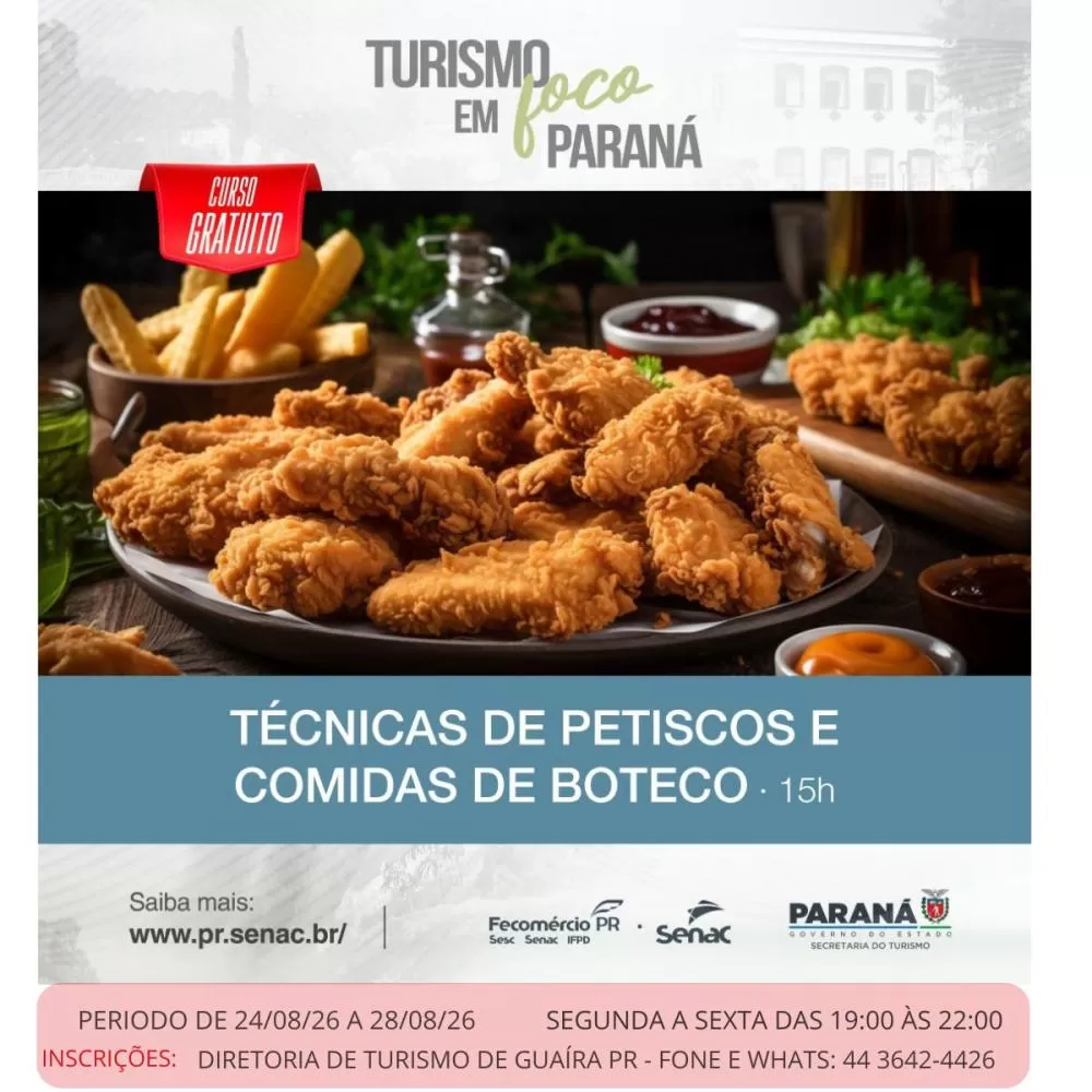 Também em Guaíra, estão abertas as inscrições para o curso “Técnicas de Petiscos e Comida de Boteco”, com carga horária de 15 horas. As aulas ocorrerão de 24 a 28 de agosto de 2026, de segunda a sexta-feira, no período noturno, das 19h às 22 horas. A proposta é capacitar os participantes no preparo de pratos típicos e ampliar conhecimentos na área gastronômica. Inscrições no endereço eletrônico https://www.pr.senac.br/