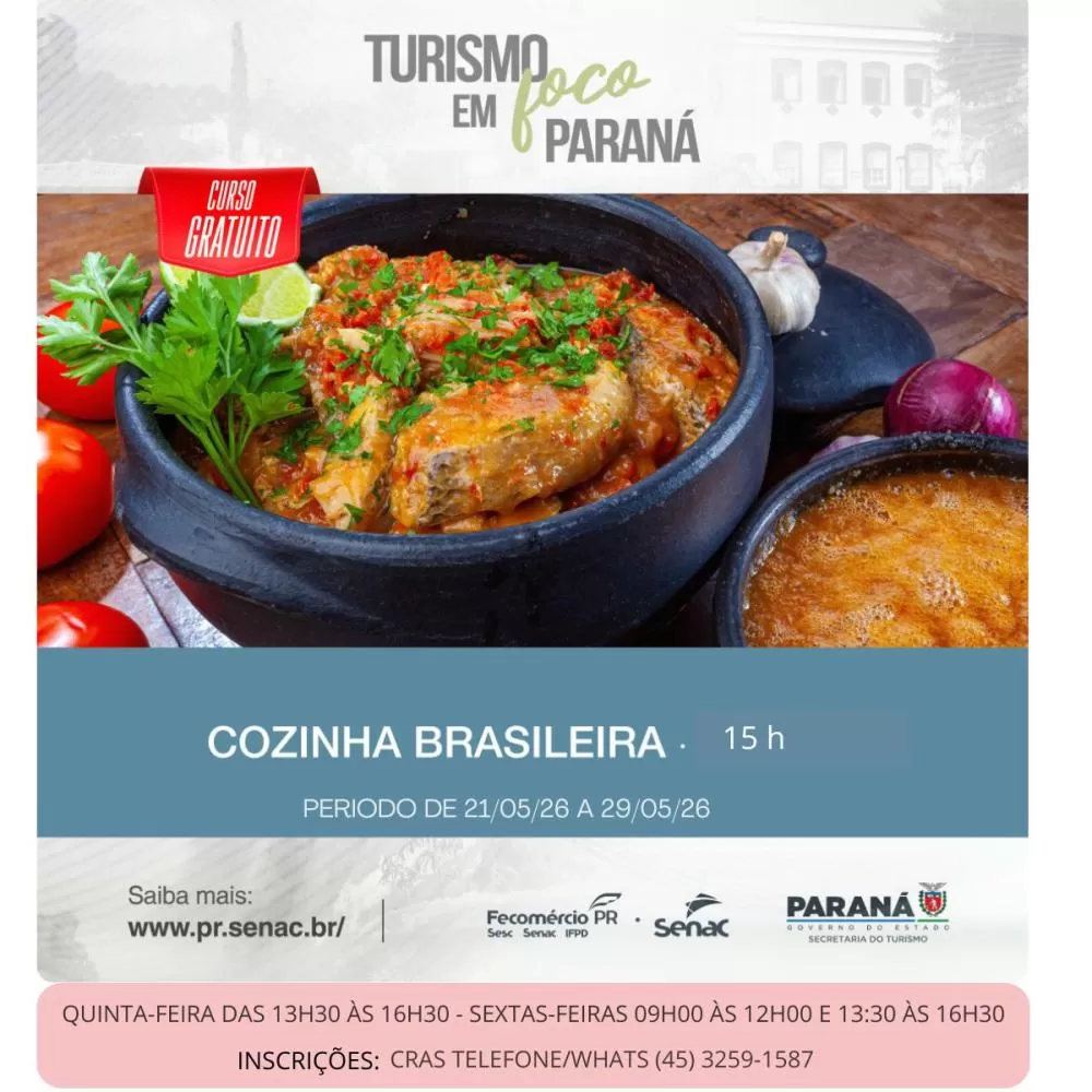 Já no município de São José das Palmeiras, será ofertado o curso “Cozinha Brasileira”, com carga horária de 15 horas. As aulas acontecem entre os dias 21 e 29 de maio de 2026, com encontros às quintas-feiras, das 13h30 às 16h30, e às sextas-feiras, das 9h às 12h e das 13h30 às 16h30. O curso tem como foco o ensino de receitas e técnicas da culinária nacional. Inscrições no link https://www.pr.senac.br/